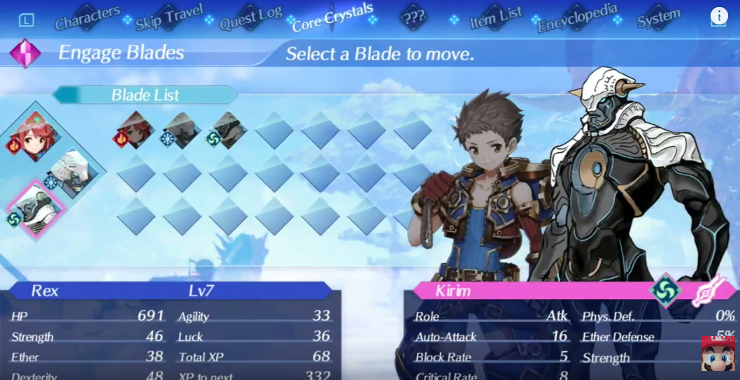 Anche gli altri personaggi hanno i propri personaggi di supporto. Durante la diretta, in party con Rex ci sono anche Nia e Tora. Tora è un tank e attira l’aggro nemica, Nia è invece un healer e può cavalcare il suo Blade.